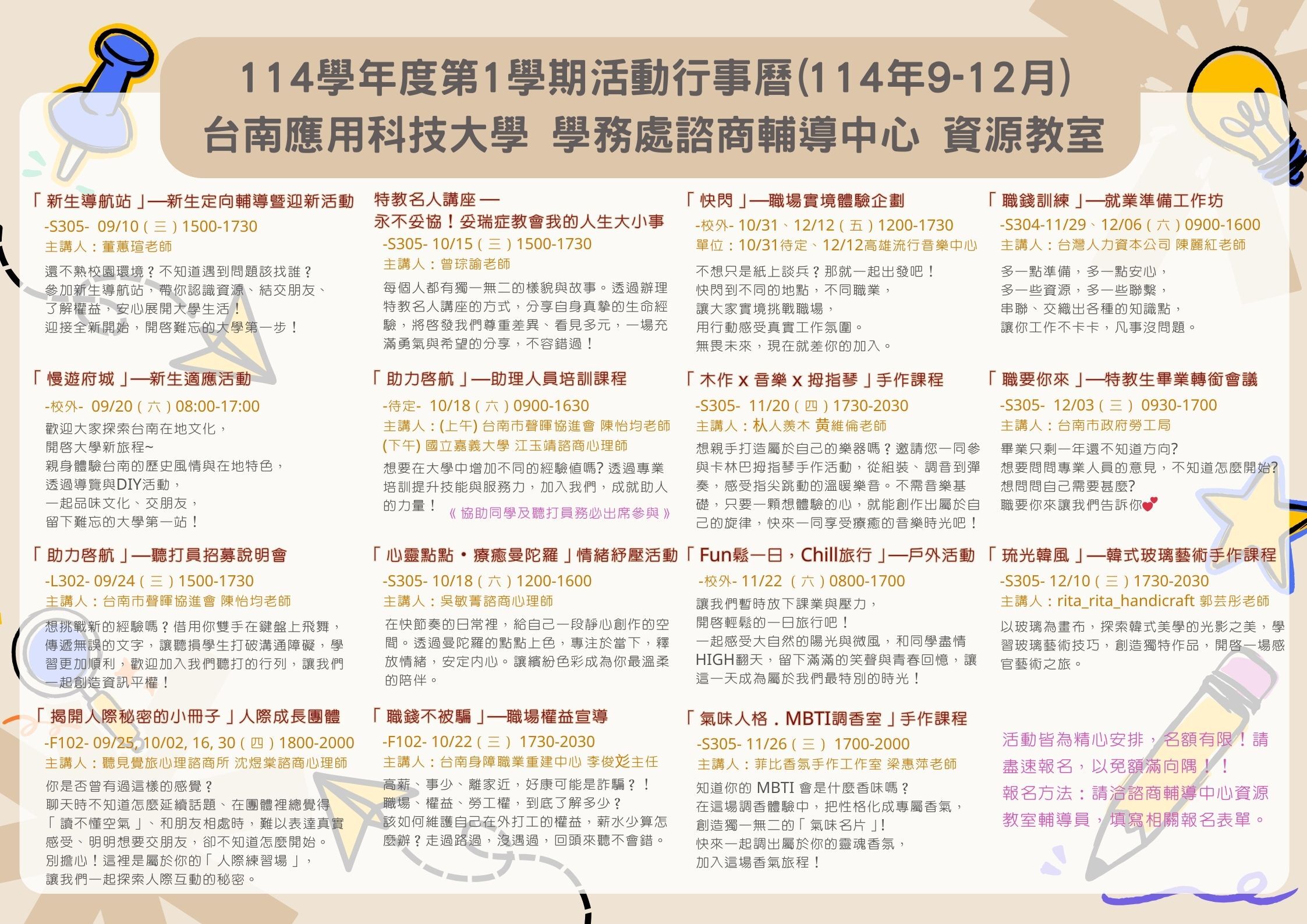 本學期資源教室準備了多元活動,包含戶外體驗、手作課程、成長團體、情緒紓壓等,讓大家在學習之餘也能收穫放鬆與成長。歡迎資源教室同學踴躍參加!