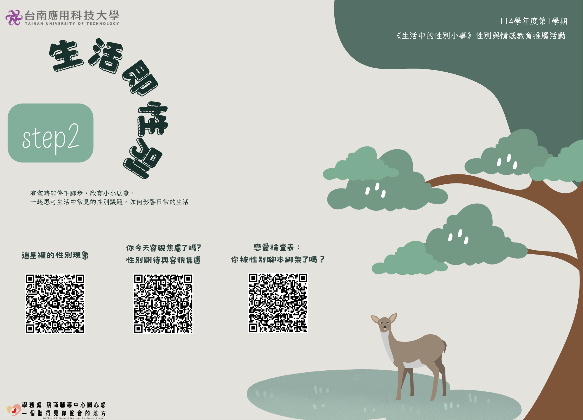 你有多久沒有聆聽自己內在的聲音?諮輔中心邀請你,在這學期,不談大道理,陪你從生活出發。透過生活性別主題靜態展覽,不僅能夠重新看見性別文化如何悄悄影響著我們的日常;